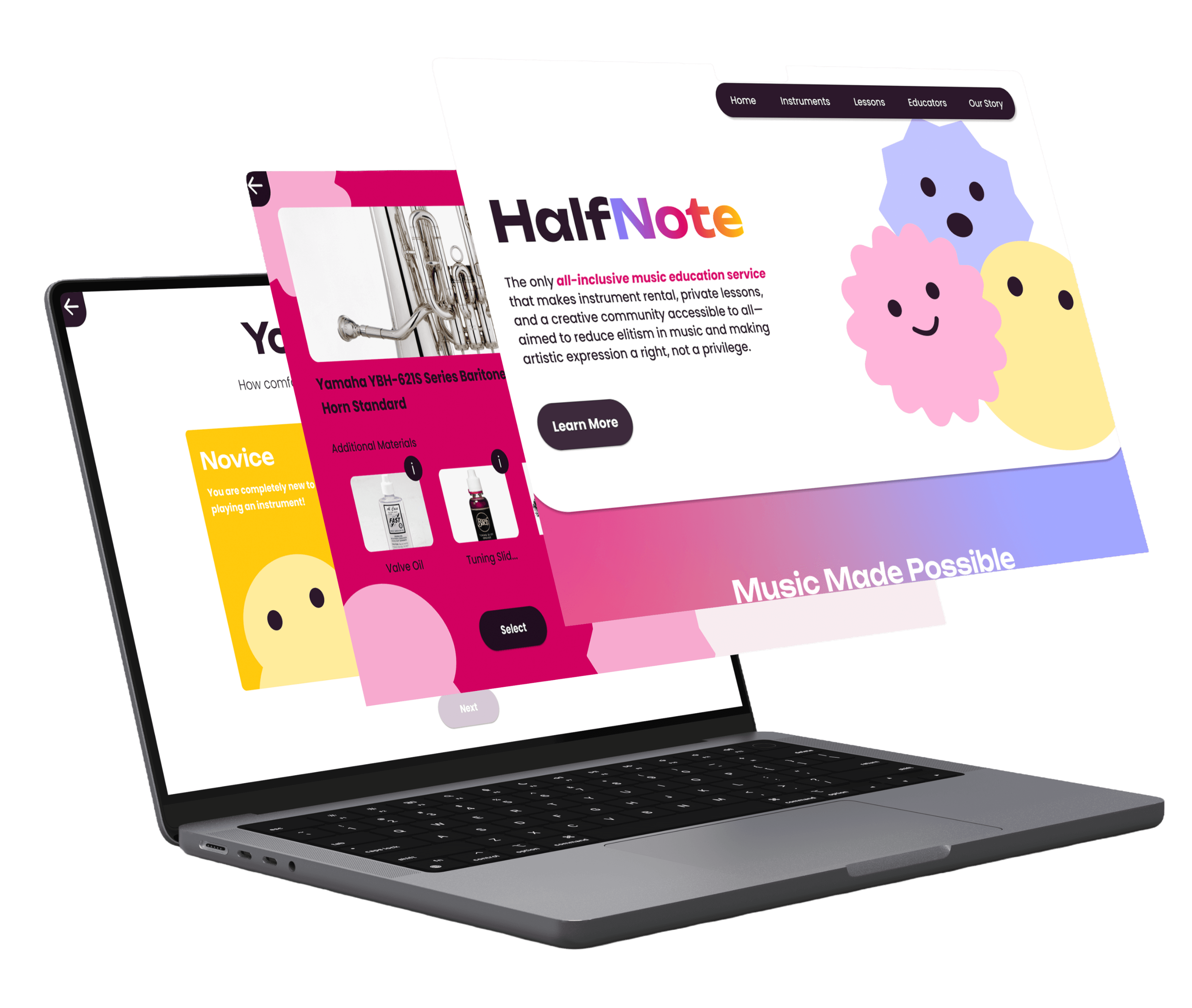 HalfNote is a group project that focuses on providing users of all ages with the ability to pursue a music education at anytime through our pop-up service. Enabling people to rent instruments, learn from professionals, and advance their understanding